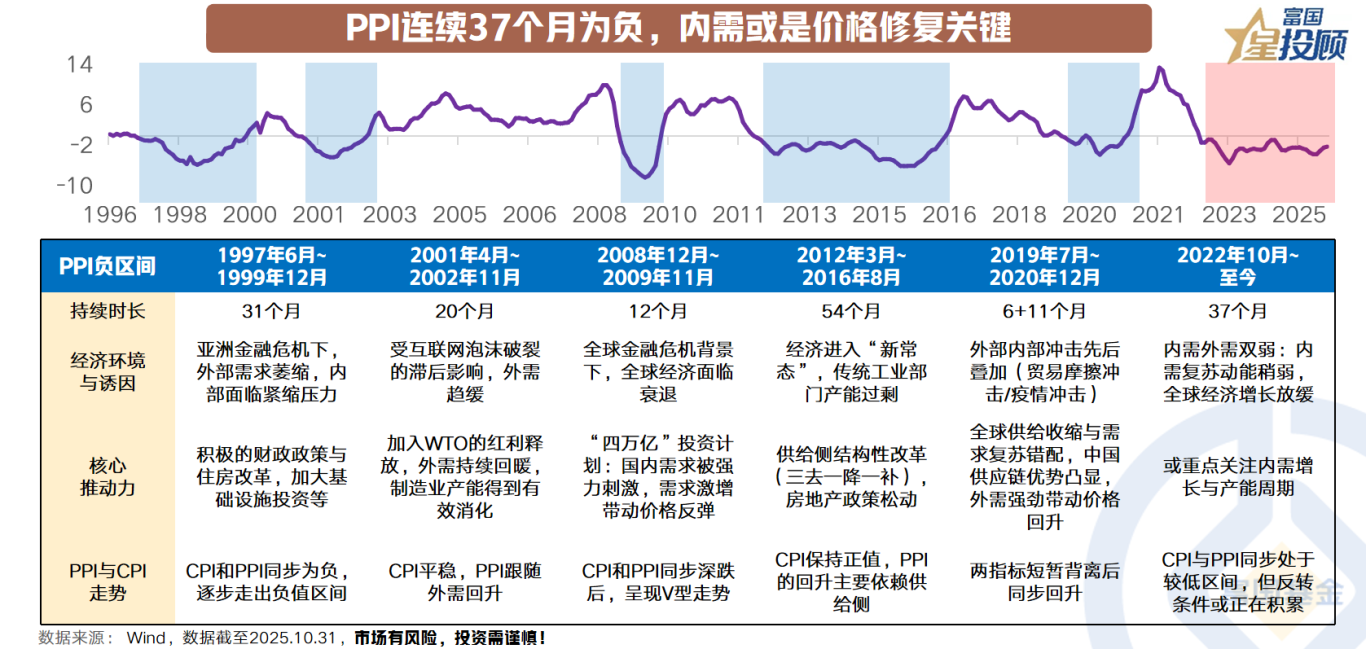 自1996年以来,我国PPI共经历六轮负增长区间,其中最长持续54个月,从各轮区间的诱因来看,除2012–2016年结构性产能过剩问题较为突出外,其余几次负增长区间的共同特征均为需求端的显著收缩。回顾历史,PPI能够走出负区间,均离不开强有力的政策干预,其核心作用机制在于有效扭转需求端的疲弱态势。当前PPI已连续37个月为负,其成因兼具需求收缩与供给内卷双重压力:一方面居民与企业部门有效需求不足,另一方面部分行业无序扩张加剧价格竞争,综合来看,内需增长或仍是本轮PPI回正的关键。