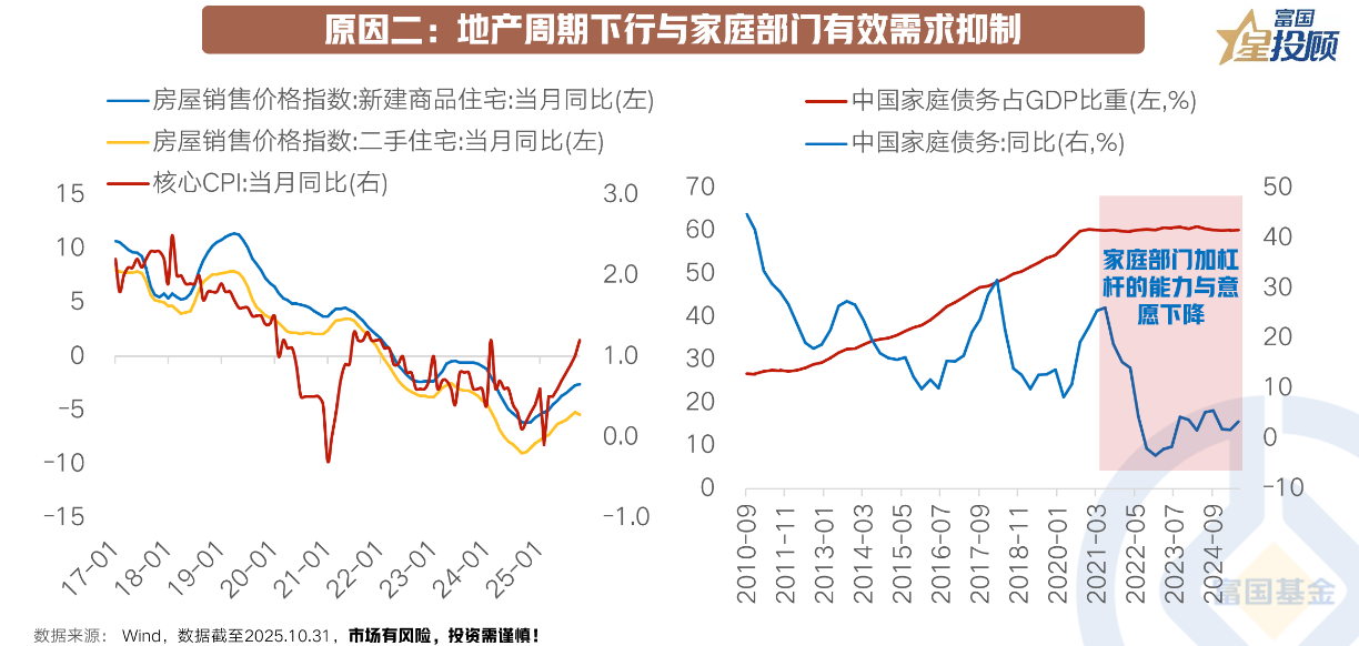 地产周期下行与家庭部门有效需求抑制是本轮低通胀的内在动因。本轮房地产市场调整以来,房价预期转弱,显著拖累居民消费信心与支出意愿。核心CPI走势与地产周期高度同步,反映居住及关联服务价格压力的持续释放。地产低迷不仅直接压低核心通胀,更通过财富效应与收入预期渠道削弱私人部门的风险偏好和支出能力。2021年以来,中国家庭部门加杠杆的能力与意愿明显下降,家庭债务同比增速转负,住房相关投资与耐用品消费同步萎缩。这种预期转弱进一步抑制有效需求增长,从而加剧低通胀压力。