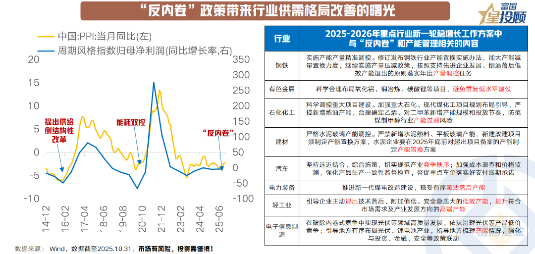 在供需失衡与内卷式竞争加剧背景下,低质低价式竞争已形成负向螺旋,显著压制PPI及企业盈利,“反内卷”政策成为中长期价格指标改善的关键抓手。历史经验表明,“供给侧结构性改革”与“能耗双控”等类似政策实施后,PPI及周期行业盈利增速均实现明显反转。“反内卷”政策实施以来,光伏、钢铁、锂电池等细分行业已在政策引导下,通过产能置换等方式优化供给结构,价格因素初现改善曙光。行业供需生态的长期健康运行,不能仅依赖行政干预,一方面要健全包括市场准入机制、知识产权保护、公平竞争审查等在内的市场制度,另一方面要提升技术创新要素占比,推动产业向高质量方向发展。