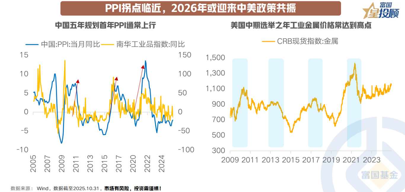 向后看,PPI同比转正的积极因素正在积累,价格修复的基础逻辑逐步夯实。从价格内部结构观察,当前主导PPI走势的核心力量已呈现筑底回暖特征,生产资料价格环比增速已率先转正,在行业层面,钢铁、煤炭、水泥及有色金属等“三黑一色”重点行业的价格环比增速多数已脱离负值区间,为PPI转正提供了坚实的支撑。从政策周期维度看,2026年有望迎来中美政策共振窗口,国内迎来“十五五”规划开局之年,重大项目或将密集落地,带动基建投资与工业需求回升;美国则处于中期选举年,执政党通常加大经济刺激力度以争取选民支持,该阶段工业金属价格多呈上行态势。内外政策协同或共同推动PPI在2026年实现趋势性回正。