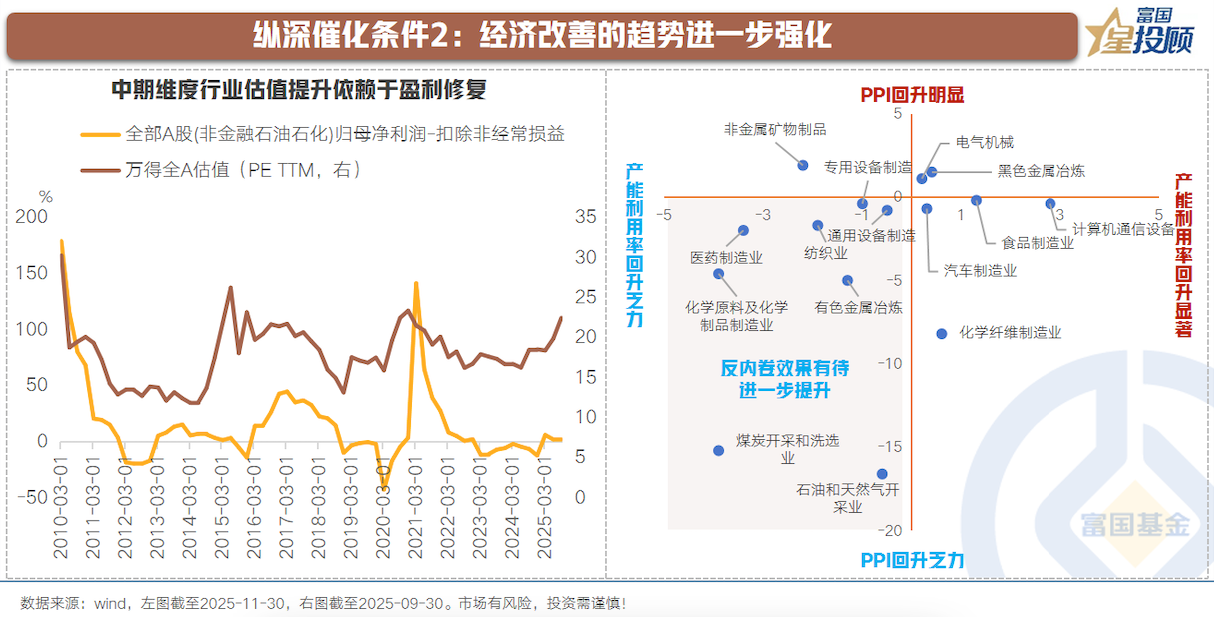 反内卷政策打开了2026年企业盈利修复的预期。从PPI和产能利用率的变化来看,已有一些行业在好转。若明年政策效用进一步强化,则有望推动经济现实进一步改善。