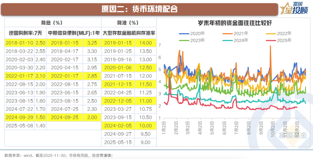 岁末年初之际,资金面环境往往更趋友好。梳理央行货币政策的时间特征,会发现:降准、降息这些宽松政策的操作时点往往集中于岁末年初。从背后原因来看,主要在于3点: