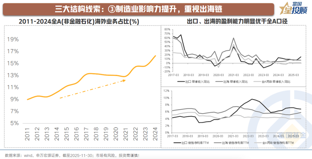 从盈利视角可以看到,对比出口、出海与整体全A(非金融石化)口径的收入、盈利,波动周期基本相同,但出口、出海的盈利能力明显优于全A(非金融石化)口径。
