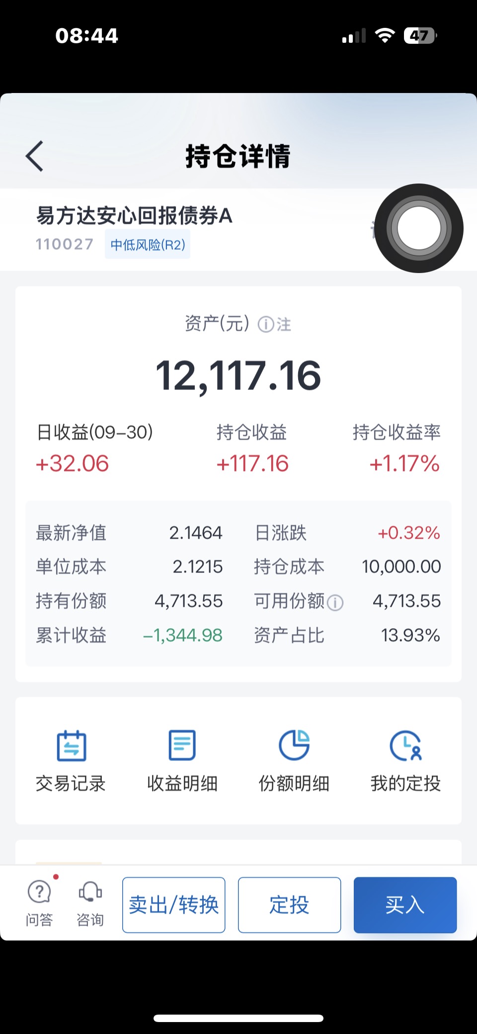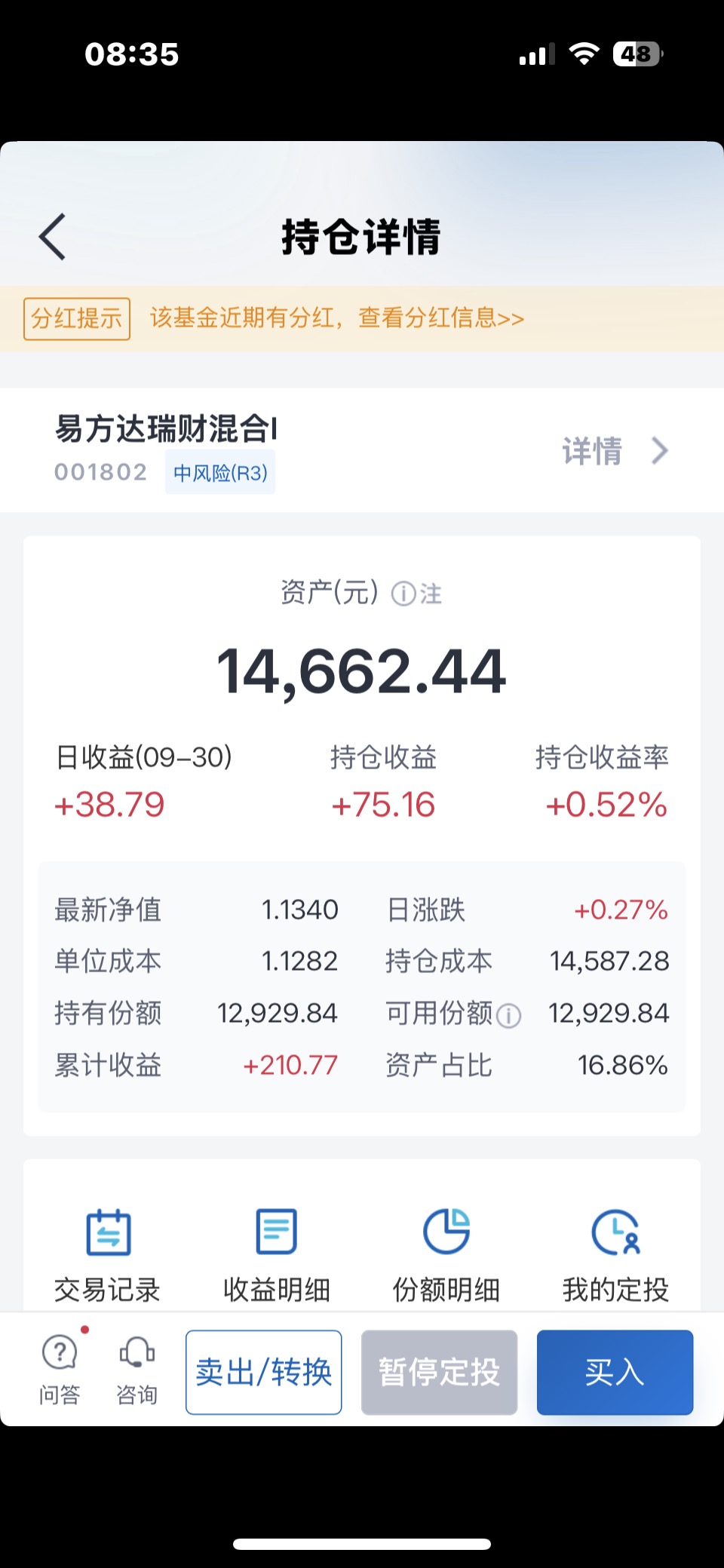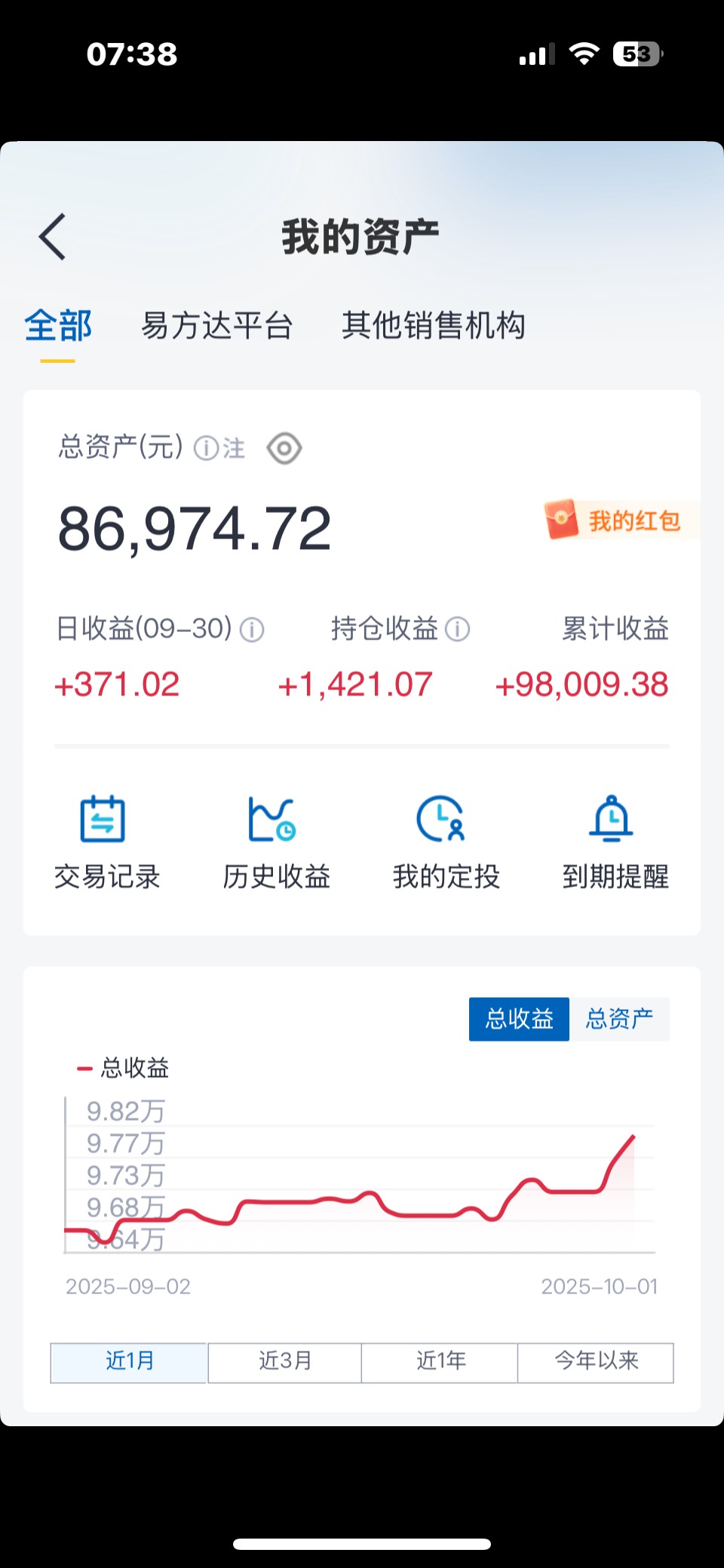 2025年三季度,老张感觉股市偏高,大幅降低天天基金股票账户基金,开始重回e钱包,计划解套易安心、易安盈。