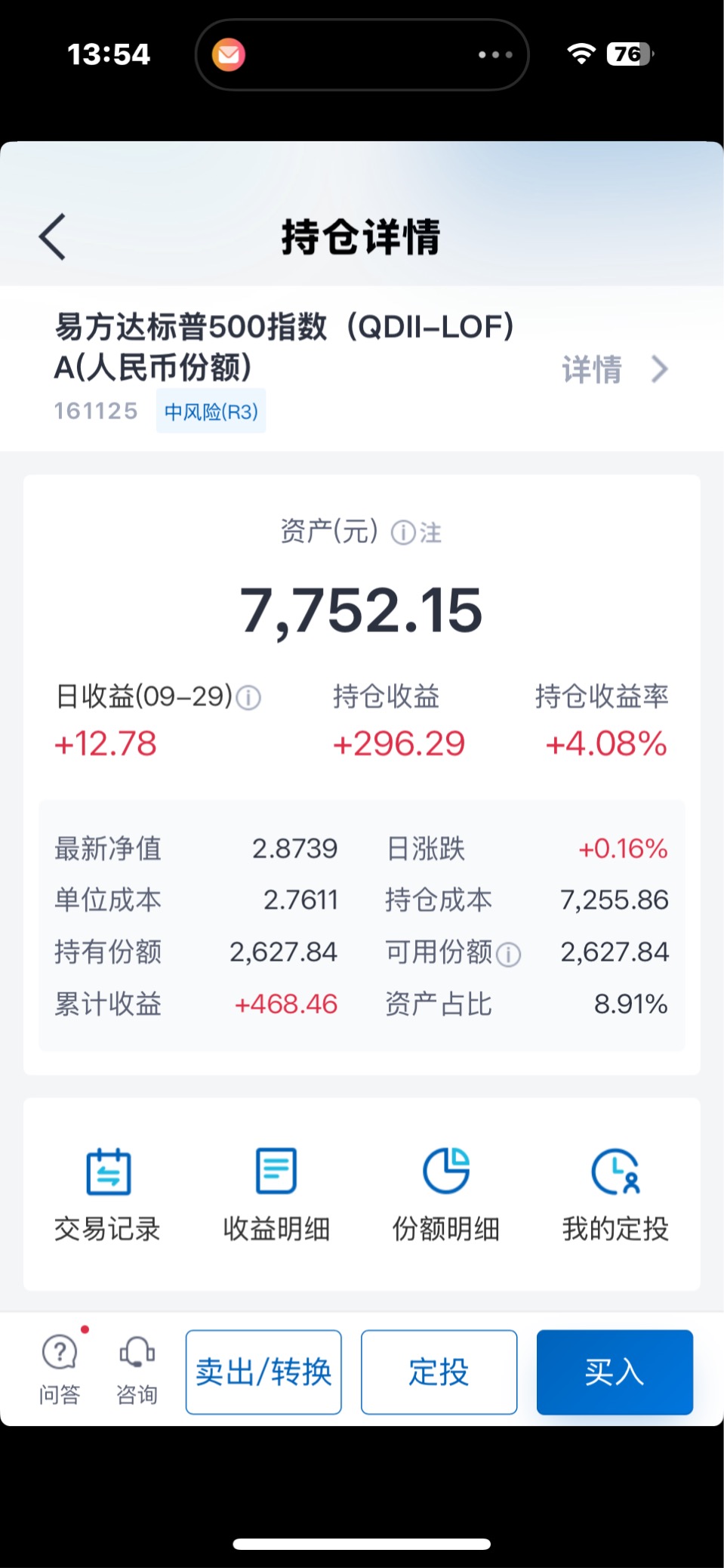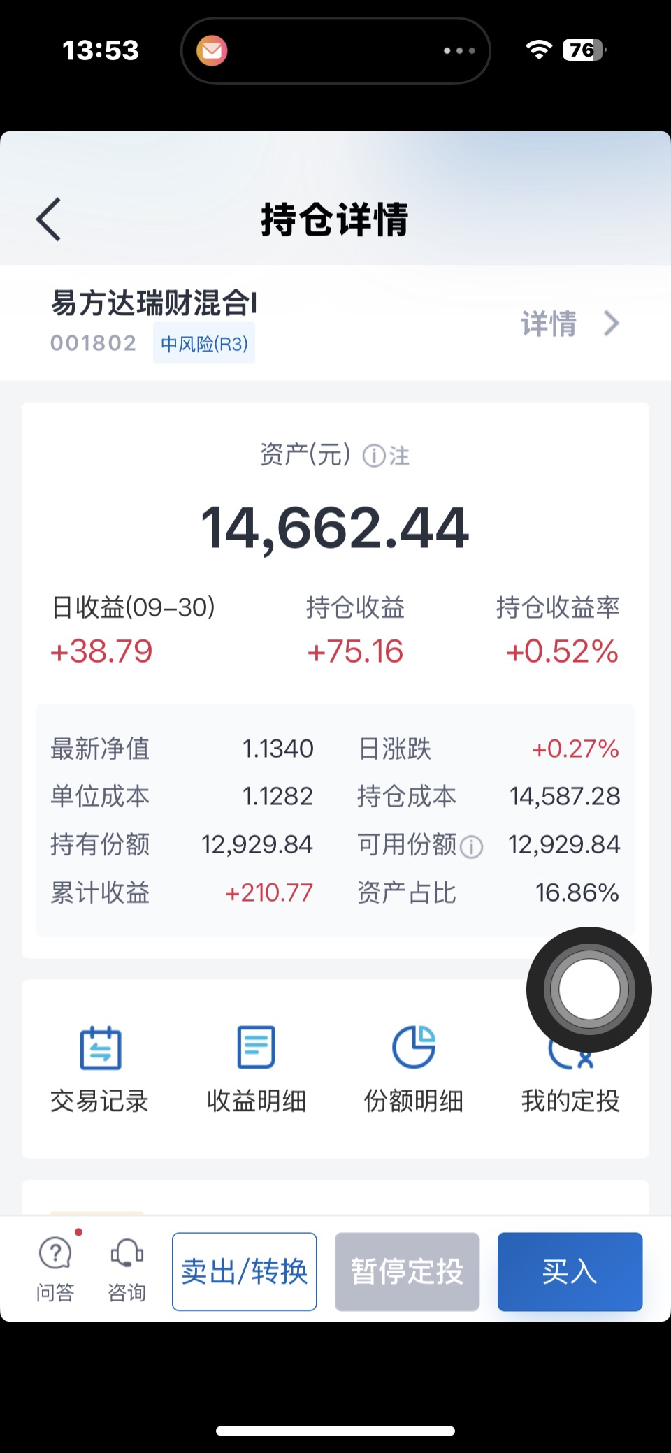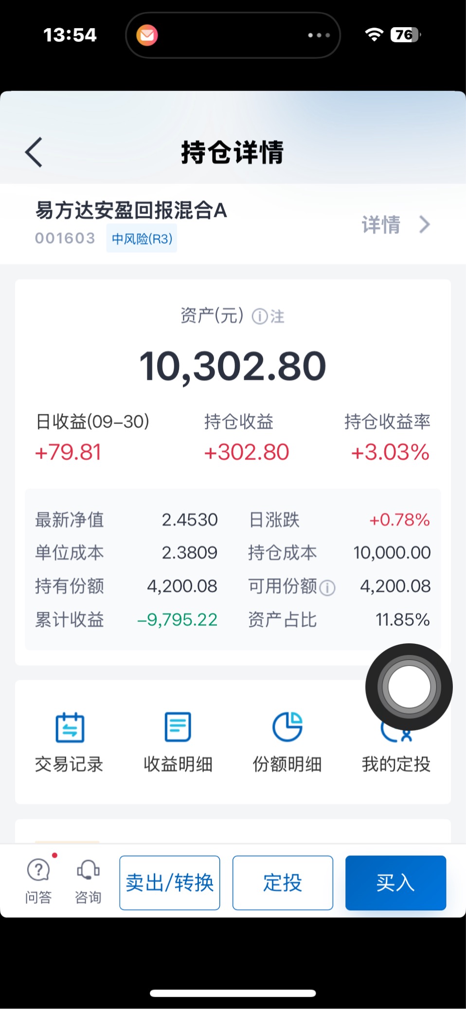 截至三季度末,天天基金持有4只基金,收益2.46万元;