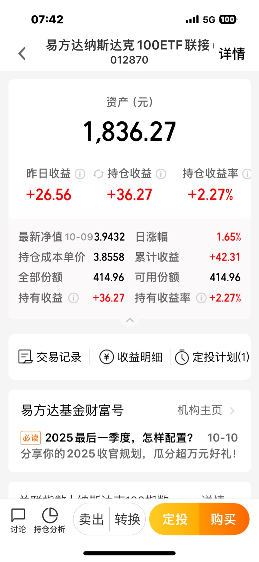 纳指100资产1800,盈利约36,收益率2.27 %。