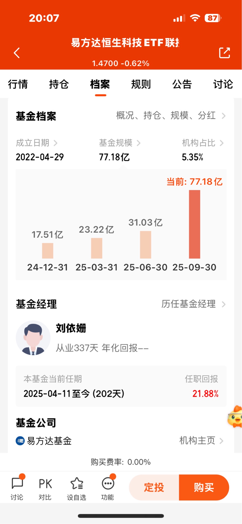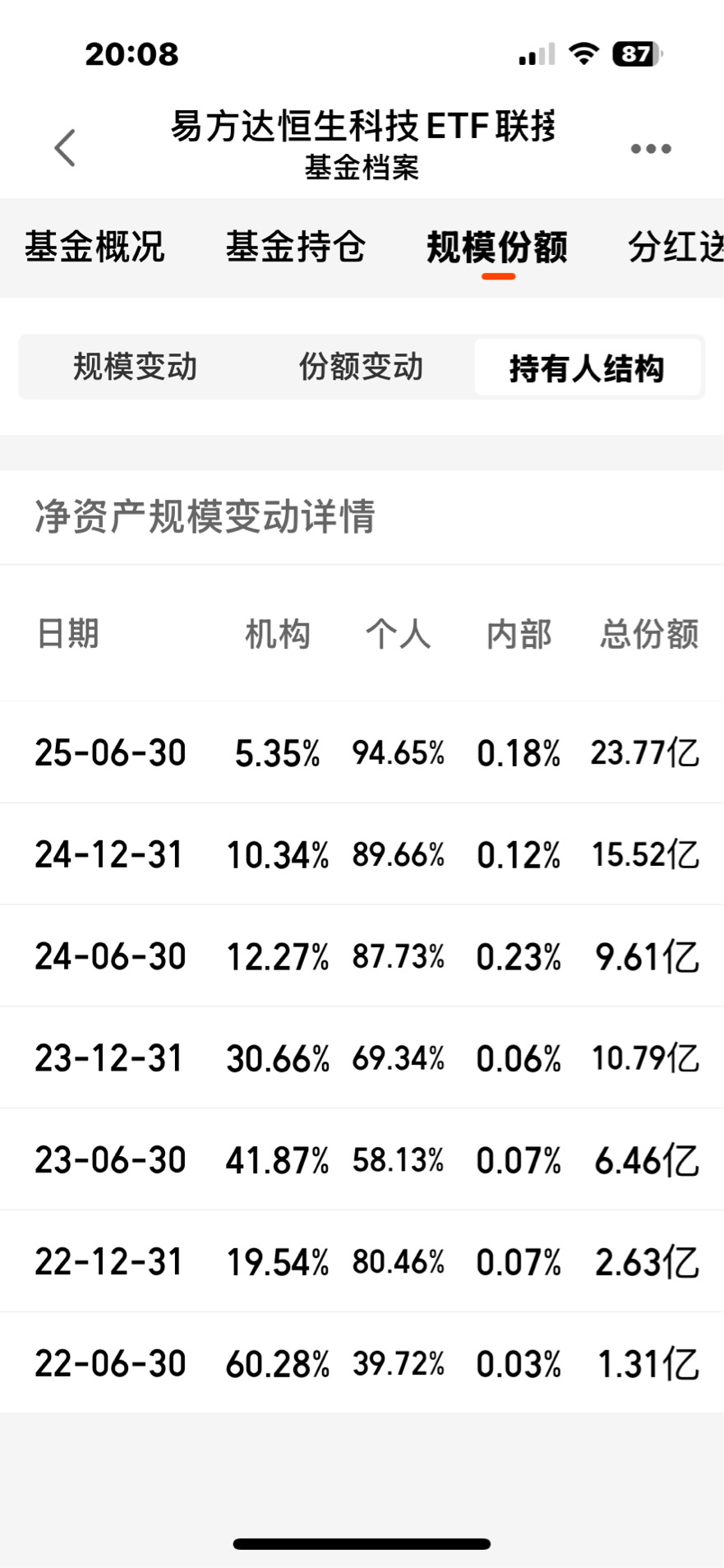 易方达恒生科技规模在扩大,机构持仓比例在大规模减仓,说明机构高位减持了,而散户开始大量高位接盘,这是一个信号,该减仓了。