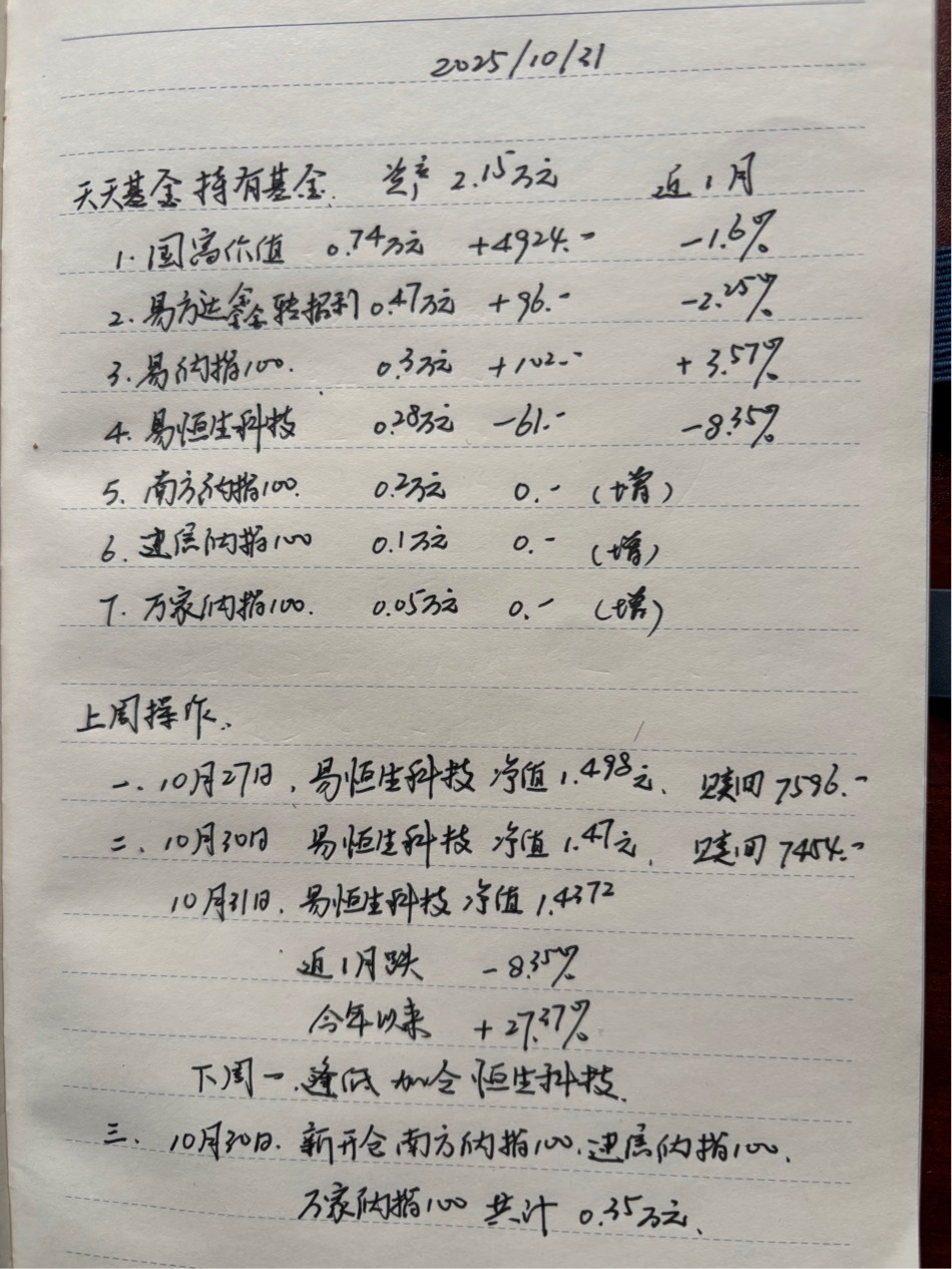 三、上周操作:10月27日、30日连续2天减仓易恒生科技计1.5万元,成功躲过本周五的大跌;10月3 0日新开仓买入3只纳指100基金约3500元;