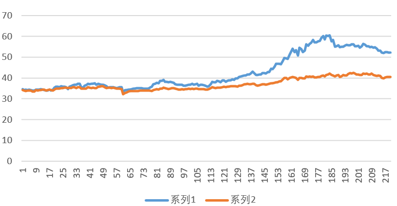 解释一下上述图表,左边竖轴上的0到70就是净值,而横轴上的1到217则是交易日的数量,系列1是轮动策略的净值走势图,系列2是沪深300的走势图,由图可以发现从第180个交易日左右开始轮动策略的净值出现了下滑。如果坚决执行轮动策略,那么近段时间收益率下降是正常表现。截止上个交易日,考虑交易手续费的情况下,场内轮动策略的净值应该由2024年12月31日的35.29714涨到2025年11月28日的52.26420,期间涨幅约为48.07%,同期沪深300的净值由2024年12月31日的35.29714涨到2025年11月28日的40.60529,期间涨幅约为14.04%。