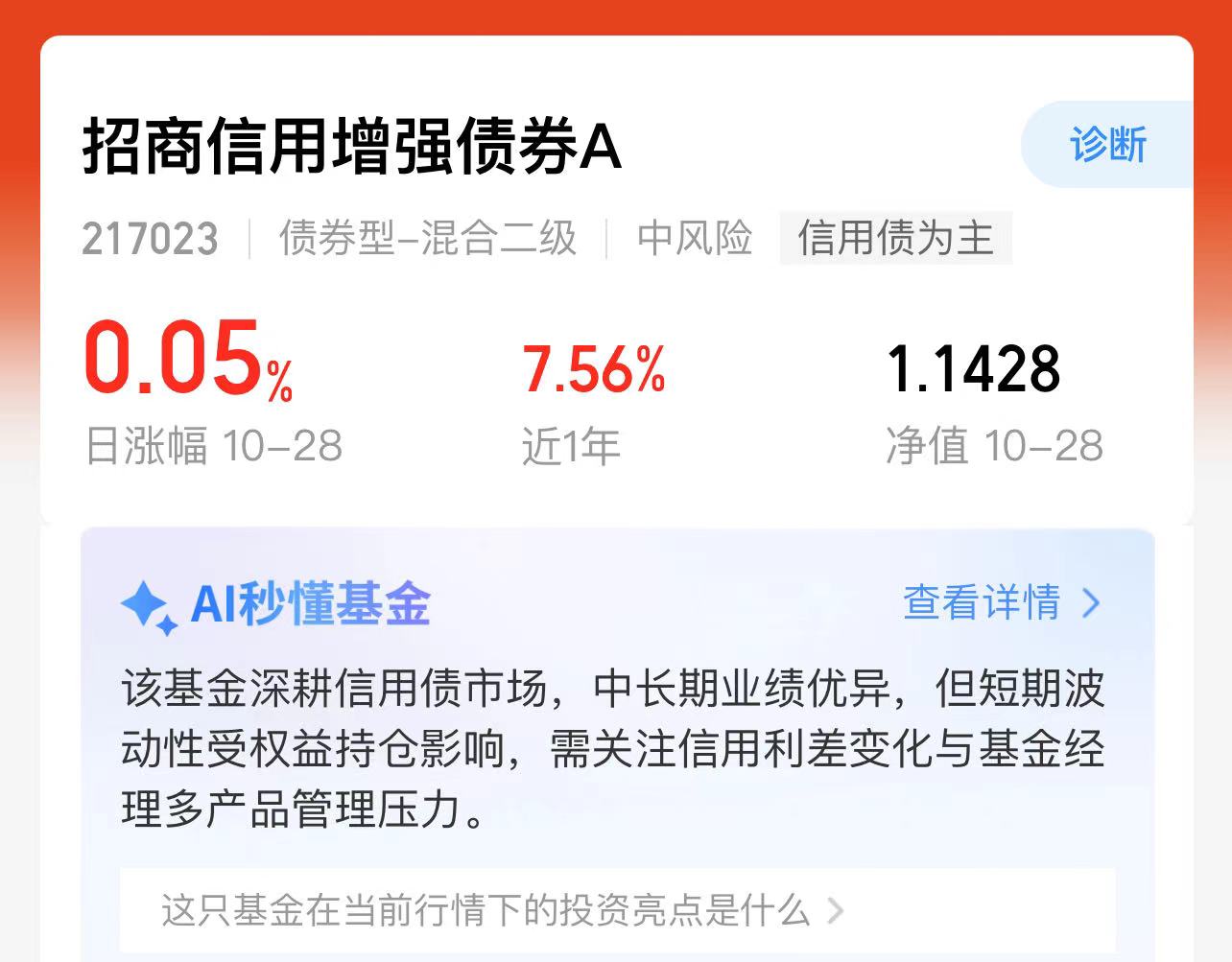 招商信用增强A昨日稳健收蛋5个,在当前利率下行与债市震荡的环境下,展现出优秀的票息收益能力与稳健风控实力。作为一只以中高等级信用债为核心配置的债券基金,它在保持低波动的同时,依然能稳步收蛋,适合作为打底型配置或短期资金的安心去处。#