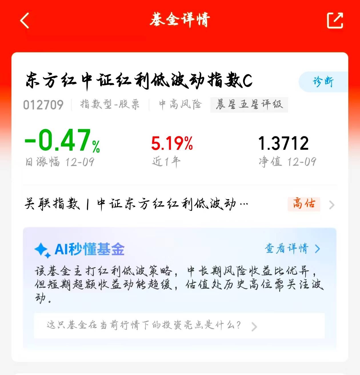 年末想避险可以考虑东方红中证红利低波动指数C,持仓分散像防波堤,近六个月1.77
