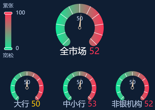 五、资金面情绪指数:全市场52 资金面紧平衡(0-100紧张度递增,50为均衡,超过50反映资金紧张)