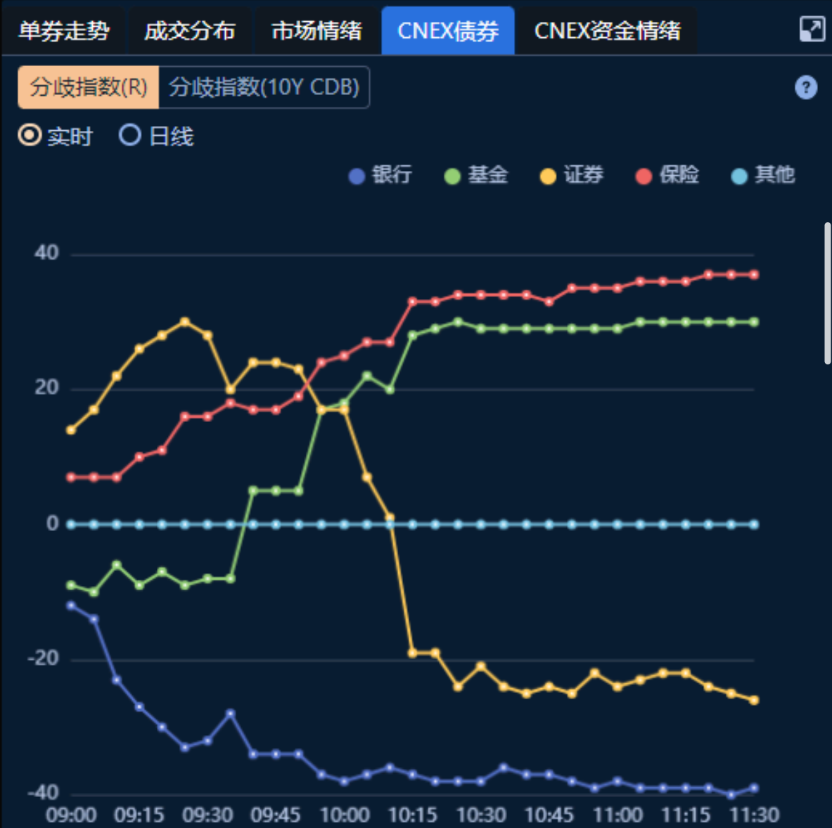 债券分歧指数显示,银行为卖方主力,券商盘初积极收券,上午10时后转为卖方情绪。