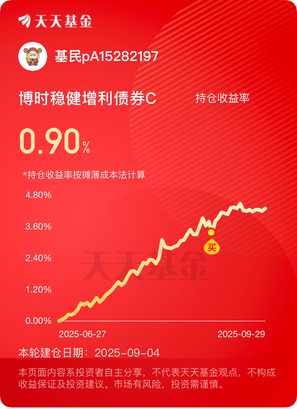 $博时稳健增利债券C$ 的收益质量很高,不是靠猛涨猛跌,而是稳步向上。昨天逆势收蛋10个,三个月累计收蛋400多个,半年涨幅已达6.78%,近一年收益已经稳稳站在了10%以上,其长期持有的优势太明显了。9 月交易商协会降低了成熟层企业准入门槛,简化了注册流程,信用债和城投债发行规模都涨了不少,城投债环比激增37%以上。这只基金持仓里超30%是企业债券,还有27%左右的金融债,这些品种的流动性和安全性都跟着提升了,相当于给收益上了双保险。更妙的是基金经理的配置思路,权益仓虽然占比不高,但行业分布很均衡,制造业、电力、医疗保健都有覆盖,既拿了高股息的稳定收益,又没错过成长股的机会。现在境外机构能通过债券回购灵活管理资金,不用被迫卖债,市场流动性更充足了,咱们的债券底仓收益有保障,权益仓还能跟着外资加仓喝汤。提醒大家别错过今天3点前的加仓窗口,国庆8天假期的票息收益可不能浪费。##DeepSeek、寒武纪同步发布引关注#