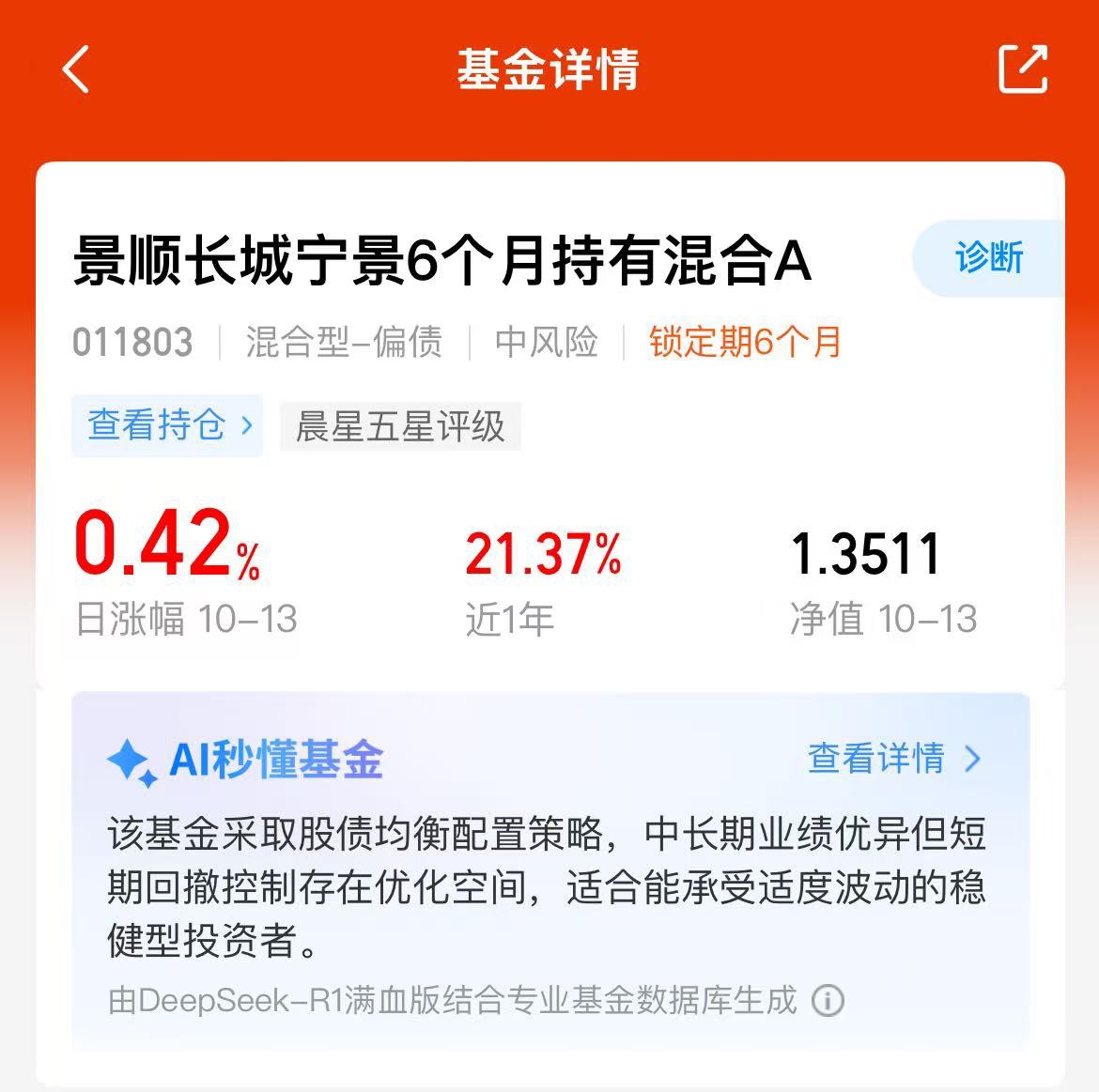 昨天股市行情不好,大部分固收加表现都不太好,朋友说他买的$景顺长城宁景6个月持有混合A$ ,昨天抱蛋42个,真正做到了能涨抗跌。#OpenAI联手博通!AI产业链怎么投?#
