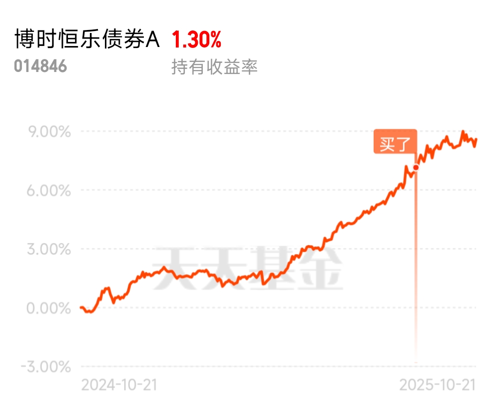 昨天债市晴天,信用债和利率债都上涨了,$博时恒乐债券A$ 昨天收了34个蛋,年收益率已经达到8.58%。最看好的就是它“债券打底+权益增强”的策略,最近的行情里,这个策略直接爆发出了超强的战斗力。近期央行货币政策的增量预期,10月20日有分析指出四季度不仅有降息空间,重启购债的条件也成熟了。这只基金的债券仓位里,利率债占比相当高,尤其是 24特国01、24特国05这类超长期特别国债,在“资产荒”背景下流动性溢价特别高,一旦央行重启购债,这类资产的价格肯定还得涨。当然更惊喜的是它的权益仓,基金经理太会选了,前十大重仓里有宁德时代、兆易创新这些消费电子和新能源股,最近行业反弹,这些个股涨幅都很可观,其权益仓正好吃到了这波红利,真正做到了“债券稳赚,权益多赚”。而且它的风险控制做得特别好,基金经理会灵活调整久期,去年波动期把久期缩短避险,今年又拉到3.2年抓收益。现在净值都涨到 1.2060了,持有体验全程在线,既保障了投资的稳健还能赚点超额收益!#指数操盘手集结令#