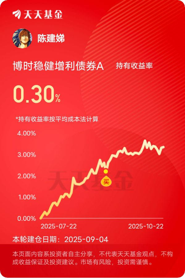 债市慢慢走稳,$博时稳健增利债券A$ 它也跟着发力,昨天又添正收益,三个月收蛋334个,一年下来累计收蛋900多。央行近期的买断式逆回购操作非常给力,相当于给市场注入了强心剂,资金面一直维持宽松状态,这对债基来说就是最直接的利好。这只基金的债券仓位配置很有讲究,之前看季报里高等级信用债占比不低,最近正好赶上短端信用债收益率下行,信用利差也在收窄,持有的债券资产自然能贡献稳定收益。更让人惊喜的是它的权益部分,虽然仓位不高,但选的标的都挺精准,像洛阳钼业这种周期股,刚好踩中了9月PPI企稳的节奏,还有兆易创新在科技板块回调后慢慢回血,这部分收益正好给债券收益加了点弹性。比起那些大起大落的股基,这基“债券打底+权益添彩”的模式相当稳健,收益一路稳步增长。现在中美经贸那边还有不确定性,避险情绪起来的时候,稳健增利这类配置均衡的基金抗跌性特别强,积少成多,长期持有下来收益很可观。#煤炭重拾涨势 要跟上吗?# #晒收益#