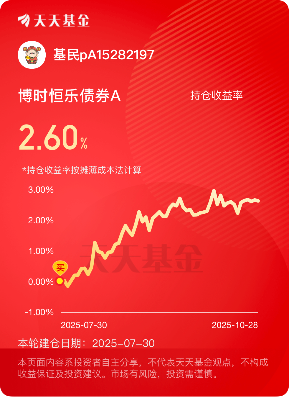 最近市场反复,固收+收益优势凸显,债券打底稳,股票部分还能博点收益。拿$博时恒乐债券A$ 来看,它近三个月涨了将近3%,一年拿下了8.82%的收益。近期央行呵护流动性,三季度以来资金利率一直维持低位,10月底又加量续作MLF,明显在维持宽松格局。这只基金的债券占比高达80%,而且以高等级信用债为主,流动性宽松意味着债券交易活跃,基金经理能轻松调整持仓久期赚价差。再加上国务院的化债政策,融资平台债务风险缓释后,它持仓的城投债估值更稳了,票息收益有了保障。再看这只基金的权益仓,其贡献更是超出预期,其20%左右的资产在权益类,而且选股思路特别清晰,既有AI应用、固态电池这些“十五五”规划相关的高景气科技股,又有消费、医药这些防御性板块。三季度科技股大涨的时候,它跟着赚了一波;最近市场震荡,防御性板块又扛住了压力。更聪明的是,它还投了些权益类基金,分散了个股风险,就算单只股票跌了,其他的收益也能补回来。这“长债稳收益+权益抓主线”的模式,长期拿着既稳又盈!#科技热点摊开业啦#