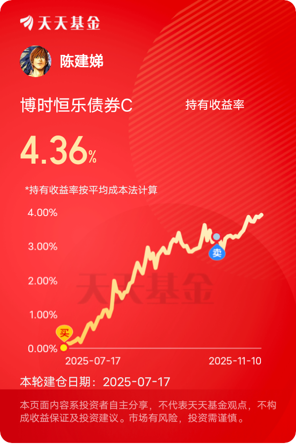 昨天$博时恒乐债券C$ 表现不错,跟涨债市,收了8个蛋,近六个月超过6%的收益,把很多同类产品甩在身后。最近它还解锁了高限额,从单日1万升到500万,这对流动性和规模都是利好。10月底还分红了,到手的50多我直接又加进去,完美实现复利滚动。近期央行开展7000亿元买断式逆回购实现等量续作,而且后续可能加量续作到期品种,这已经是连续第6个月向市场注入中期流动性。恒乐的债券部分擅长久期灵活管理,利率上行时缩短久期防跌,下行时拉长久期增利,现在流动性充裕、短端利率运行在政策利率下方,正好契合它的操作策略,这也是它能持续盈利的重要原因。现在机构普遍看好年末债市行情,华源证券预判10年期国债收益率重回1.65%左右,对恒乐来说又是一大利好。其权益仓位的表现也超出预期,基金经理不追热点,聚焦业绩确定性强的标的,最近还加仓了新能源和AI相关的科技成长股。随着产业升级政策的推进,这些板块的结构性机会越来越明显,恒乐通过沪港深三地精选个股和ETF布局,成功捕捉到了这波红利,权益部分在三季度就贡献了超额收益。而且它的权益仓位不超过20%,风险可控,就算股市波动,对整体净值的影响也有限。现在大盘在4000点震荡,正是布局好时机。#科技小登大揭秘# #晒收益#