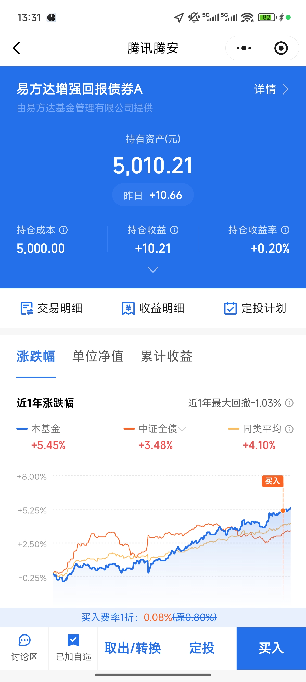 市场呈现“快速轮动,高位震荡”的特点,为了降低组合波动,继续买入5000元易方达增强回报。