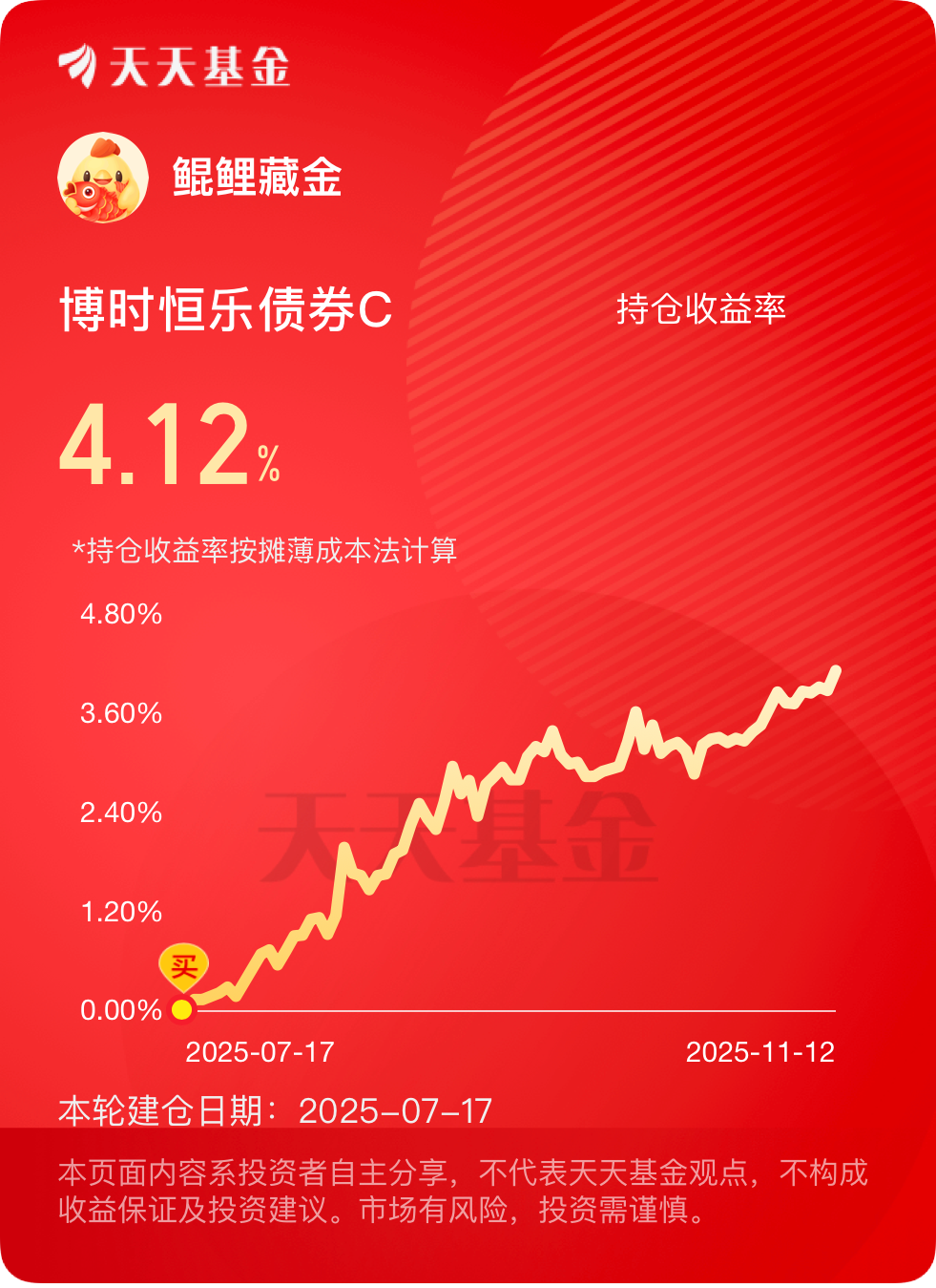 昨天债市行情有所好转,$博时恒乐债券C$ 直接收了20多个蛋,近六个月累计收蛋600多。还惊喜的发现10月底分红了,我多了三十多块进账。现在申购限额也大幅放宽了,从1万跳到500万,这对基金的流动性肯定是好事,感觉前景更稳了。10月制造业PMI降至49.0%,经济复苏动能偏弱,这种情况下债市利率上行压力减小,对于债券基金来说是重大利好。而且华泰证券、华源证券等多家机构都预判四季度债市反弹窗口期延续,10年期国债收益率有望重回1.65%左右,这对于博时恒乐这以债券为核心的基金来说,无疑是锦上添花。而且基金经理会根据市场变化灵活调整久期,比如之前资金面收紧时缩短久期,利率企稳后又适度拉长,这种“防守反击”策略让基金在债市波动中始终保持稳健,票息收入稳定,为收益提供了坚实基础。其权益部分的表现更是超出预期,重点布局了高股息红利股和金融板块,像能源、公用事业领域的红利股,不仅分红稳定,而且在市场波动时抗跌性强,而金融板块近期受益于政策利好,表现也很亮眼。基金还配置了国泰中证全指证券公司ETF来对冲风险,进一步提升了权益部分的稳健性。#段永平:投资茅台不需要太看宏观环境#