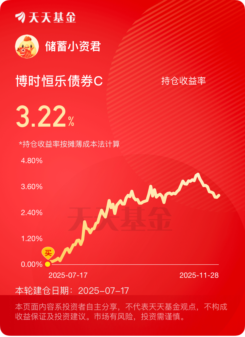 $博时恒乐债券C$ 在当前市场中,固收+是很值得关注的策略,它核心配置债券以控制波动,同时辅以权益资产来增强收益。以$博时恒乐债券C$ 为例,上周五产蛋9个,近六个月521个蛋的收益,业绩在同类产品中排名靠前。加之近期分红带来的现金流,以及单日限购100万的风控措施,这些都有助于基金的长期稳健运作。近期债市回调后配置价值凸显,11月末债市出现短期调整,但华创证券、甬兴证券等机构都明确表示,这只是短期调整而非趋势性下跌,当前信贷、消费等基本面数据仍偏弱,不支撑利率持续上行,而且央行维持流动性合理充裕的立场没变。博时恒乐的债券仓位以利率债为主,这类资产在利率波动时抗风险能力更强,加上基金久期控制合理,在11月债市曲线熊陡的行情中,债券部分不仅没亏,还贡献了稳定收益。更重要的是,随着10年国债收益率达到到1.8%左右,利率债的交易机会开始浮现,机构预判12月债市胜率会提升,现在正是买入时机。另一个惊喜是权益仓位的高股息策略见效了!基金权益部分除了科技成长股,还配置了不少高股息的消费和金融股,近期消费板块的永太科技涨幅超6%,金融板块也随着政策利好有所回暖。这种“高股息防御+科技成长进攻”的双核体系太聪明了,在股市3900点震荡的行情中,高股息股能提供稳定分红,科技股则能捕捉弹性收益,配置时机不错。#今年你的投资目标达成了吗?# #晒收益#