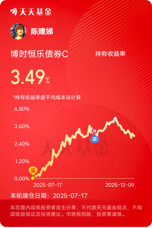 经验告诉我们,震荡市里配置“固收+”往往有惊喜。比如$博时恒乐债券C$ 债券是压舱石,股票是收益增强器。近半年4.52%的回报,在当下同类产品中很能打。基金经理近期主动将限购从单日500万降到了100万,这波主动控制规模,眼光挺长远的。12月2日发布通知放宽募集资金用途,允许直接用于支付并购价款、偿还并购贷款等。这对恒乐持仓的信用债来说是重大利好,因为并购票据机制优化会拓宽企业债券融资渠道,提升信用债市场活跃度,同时降低企业发债成本,信用债的违约风险也会相应下降。这只基金的债券资产占比 有八成左右,其中信用债占比不低,并购票据机制优化后,信用债市场的整体环境会改善,基金的债券持仓不仅能获得稳定的票息收益,还有可能因为债券价格上涨而获得资本利得。其权益仓方面,占比虽然不高,但选股思路很对当下的市场热点。现在股市在3800点附近,券商板块作为牛市先行指标,后续潜力很大,这基的权益仓中布局了相关顺周期板块,能间接受益于股市活跃度提升。而且它的权益仓聚焦制造业、采矿业等行业龙头,这些企业业绩稳定,估值合理,在市场震荡时抗跌性强,在市场上涨时又能提供弹性。#茅台批价两年跌43%!反映了什么问题?# #晒收益#