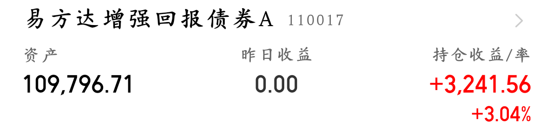 不过还好,咱们布局的 $易方达增强回报债券A(OTCFUND|110017)$ 不仅重仓了信用债,还覆盖了一些个股,个股层面覆盖的都是偏红利类的资产,长江电力、伊利股份、海尔智家今天盘中的表现都还不错,有望带动基金继续收涨走高。