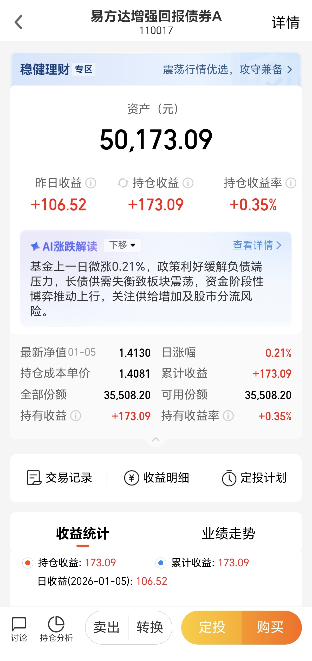 易方达增强回报债券A是去年11月7日买入,截至1月5日,持仓收益0.35%。从买入以来的净值波动来看,给人的体验就是一个字,稳。最大跌幅0.21%,最大涨幅同样是0.21%,在债市波动较大的单日,净值波动往往保持零波动,体验感不错。