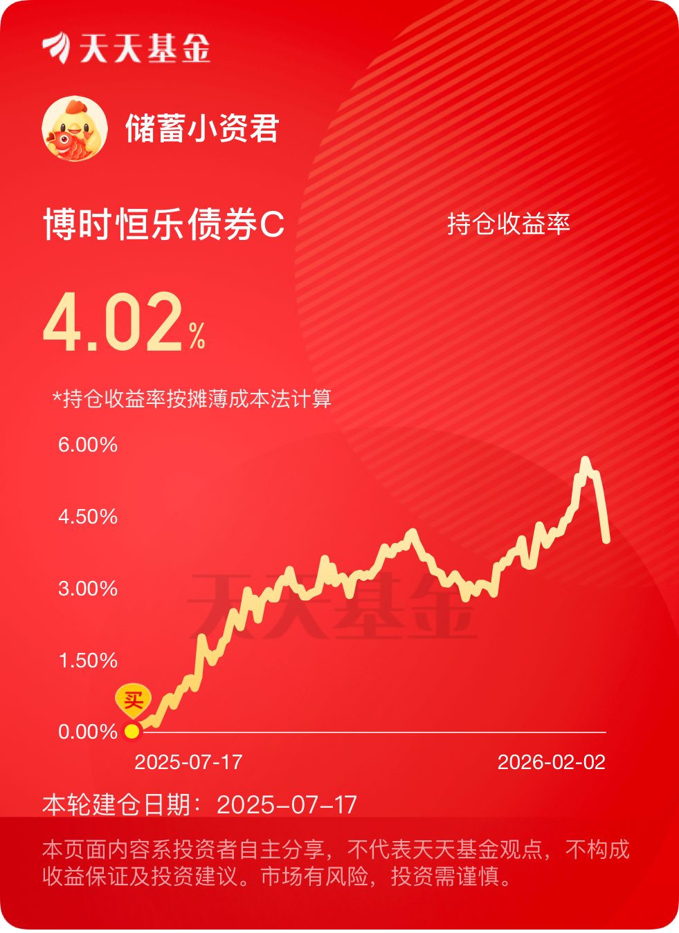 最近股市波动不算小,稳定性就显得尤为重要了。$博时恒乐债券C$ 就是我的压舱石,债券打底提供安全感,股票增强贡献弹性,业绩曲线平滑向上,近一年年化收益超过7.3%,这慢就是快的收益让人很安心。最近债市环境本来就不错,尤其是春节前这段时间。央行通过逆回购等操作给市场放水,保证资金面宽松,这样一来债券市场就有了稳定的资金支撑,咱买的债券基金自然就有了“定心丸”。过去五年春节前央行资金投放都很到位,7天资金利率基本不会大起大落,这种环境下,博时恒乐的债券部分就能稳稳赚收益,这也是它固收打底的核心优势所在,细水长流的正收益,累积起来就很可观。而且恒乐作为二级债基,不是只投债券,还有一部分权益仓位用来增强收益,前十大重仓里有中国平安、中信证券、中国太保这些金融股。最近权益市场震荡回调,很多高风险基金跌得让人揪心,但金融股相对稳健,尤其是券商股,随着债市活跃度提升,券商的债券承销、交易业务肯定会受益,中信证券作为行业龙头,后续上涨空间可期;中国平安这种保险股,本身估值就不高,而且保险资金大量配置债券,和债市行情共振,最近股价也比较抗跌,甚至还有小幅上涨。眼下债市大环境好,权益部分的金融股又有估值修复的机会,回调我直接补仓,多攒筹码等涨。#美股存储概念股大涨:供应或持续短缺#
