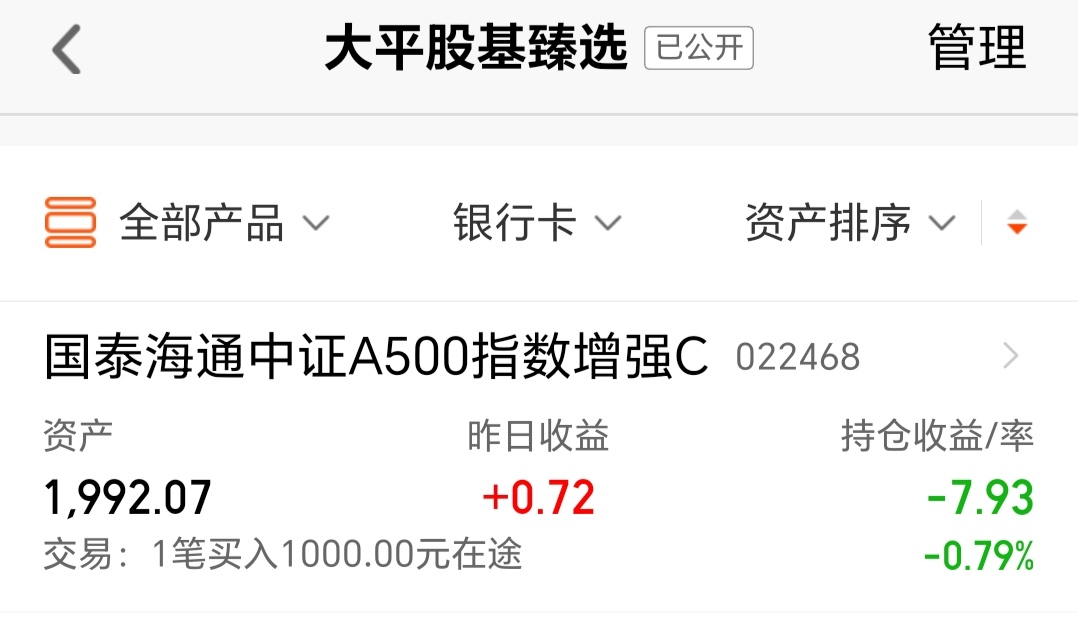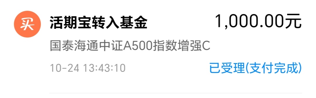 今天我买入$国泰海通中证A500指数增强C(OTCFUND|022468)$1000块钱。