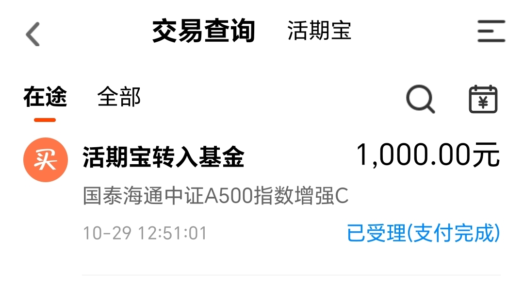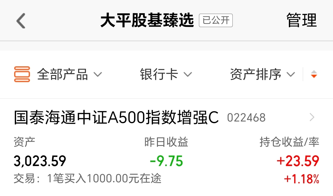 今天我买入$国泰海通中证A500指数增强C(OTCFUND|022468)$1000块钱。