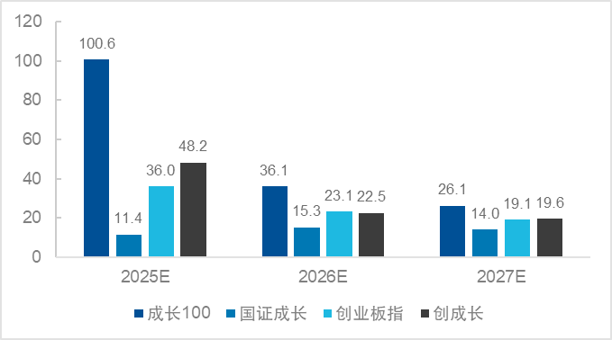 美联储降息为成长股投资注入双重动力。海外方面,降息预期已持续推升风险偏好,历史数据显示,成长股在无风险利率下行环境中弹性大——例如2019年美联储降息后,纳斯达克指数两年内上涨超60%。国内层面,经济企稳与政策支持形成合力:中央政府通过中长期资金入市托底资本市场,市场稳定性增强;同时,无风险收益率持续下行(如国债利率走低),私人部门配置权益资产的必要性上升,为成长股估值提供支撑。当前宏观处于复苏阶段,企业盈利结束三年低迷,有望企稳反弹。成长100指数尤其受益于此:其成分股聚焦高增长赛道,2025年净利润预期增速高于同类指数(数据来源:wind,截至2025/9/24)。