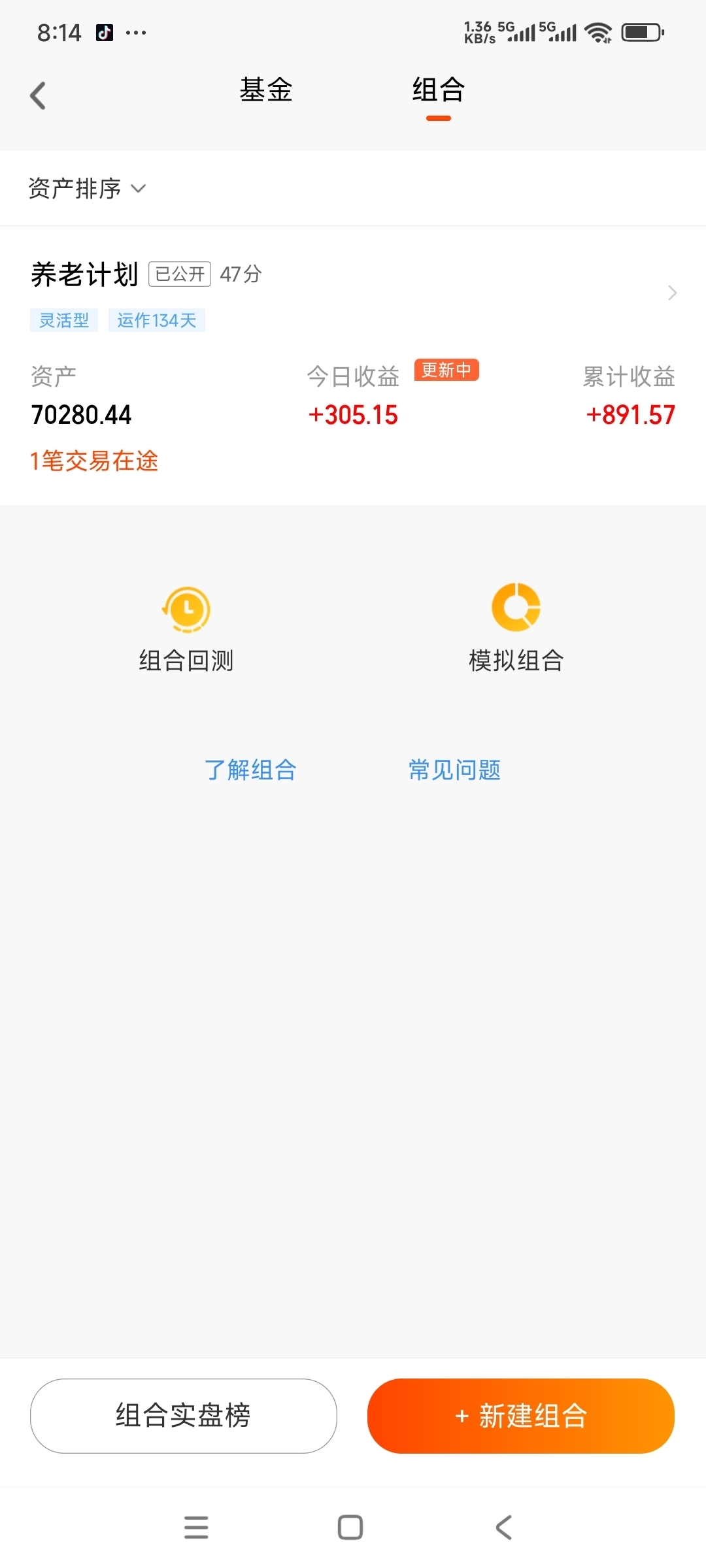 今日收益:305元,累计收益:891元。