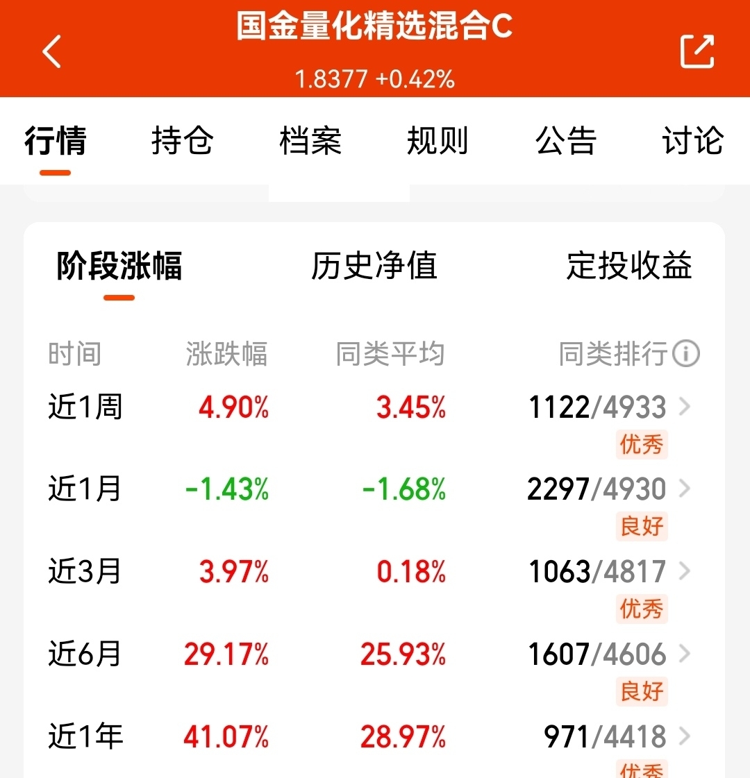 长期拿些量化基也不错,$国金量化精选混合C$ 限额打开啦,这都连续红了6天了,长期抗跌能力强