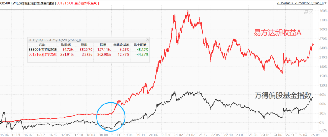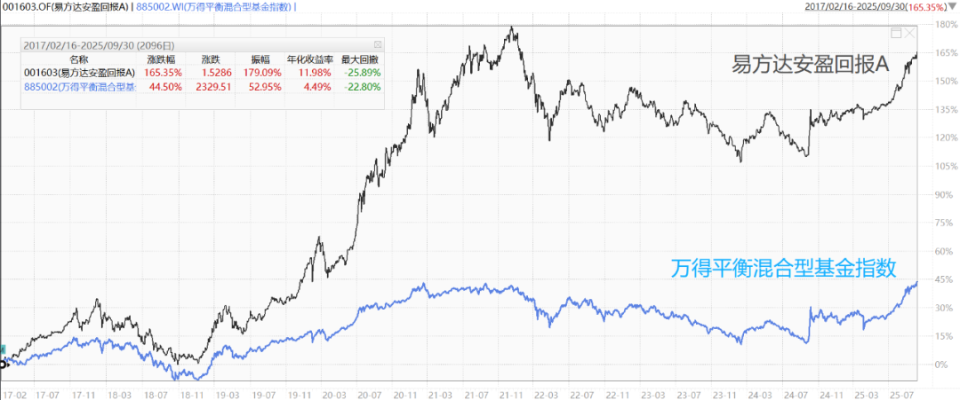 下图为管理基金以来对比万得平衡混合型基金指数(2017-2-16至2025-9-30)
