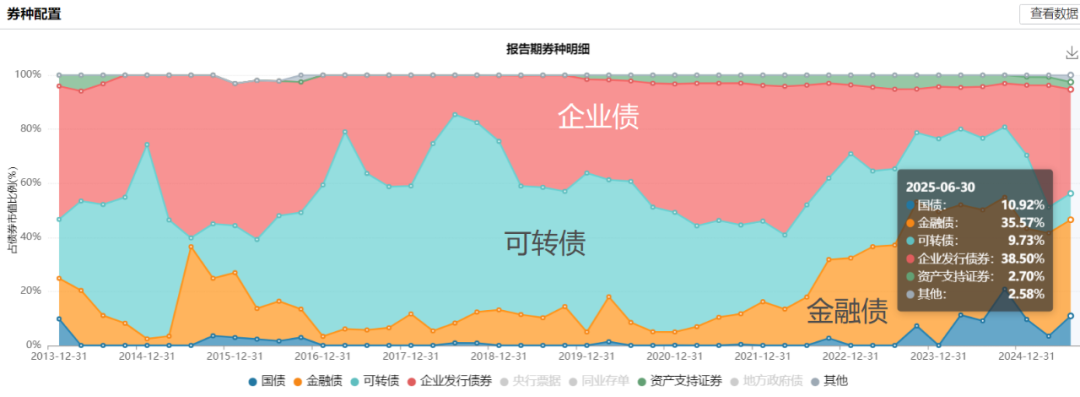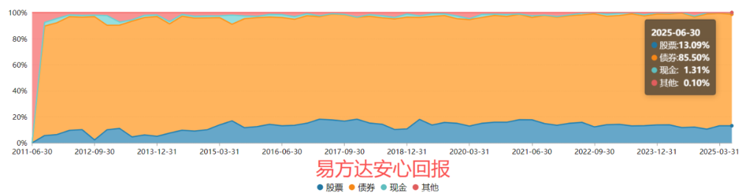 下图是管理易方达安心回报以来的资产配置情况,季度之间小幅度的调整还是比较多的。(2013Q4至2025Q2,数据来源:wind)