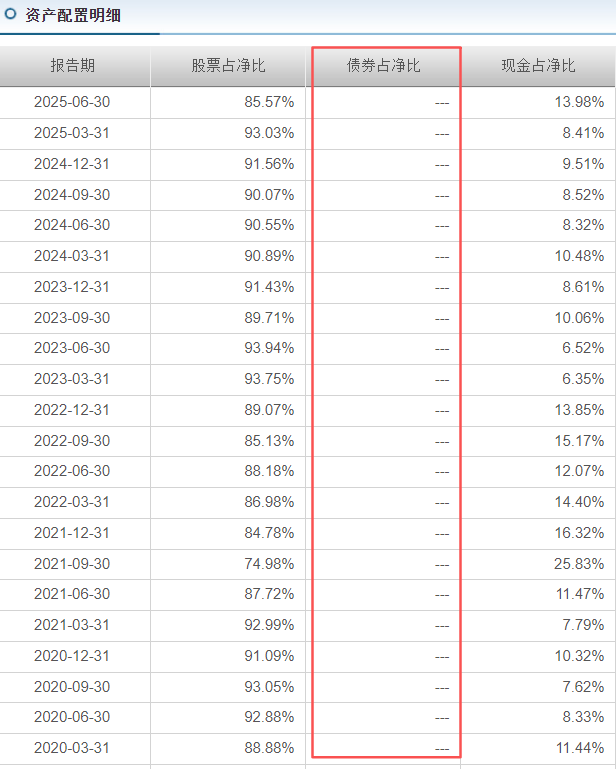 无论牛熊,基金经理始终高股票仓位运作,同时剩余仓位只持有现金,未投资于债券。