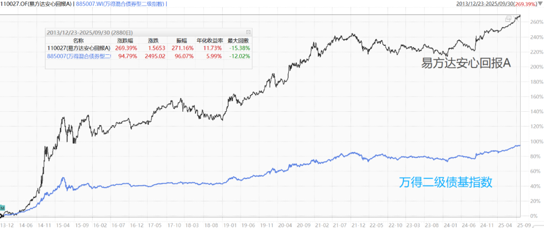 张清华管理易方达安心回报以来取得11.73%的年化收益率,大幅跑赢代表同类平均水平的万得二级债基指数,甚至战胜了一些股票指数,在同类基金中排名第一。(2013-12-23至2025-9-30,数据来源:Wind)