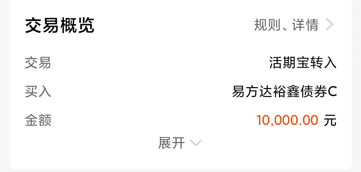 目前易方达裕鑫债券C规模目前超40亿,说明资金都在投入安心回报这类优质的固收+产品。当下纯债还有赎回费率利空悬而不决,权益波动风险难控,稳中求进姚姚还是选固收+,今儿打入闲钱1w,反正它的净值曲线一路稳稳向上,没什么择时压力,冲了!
