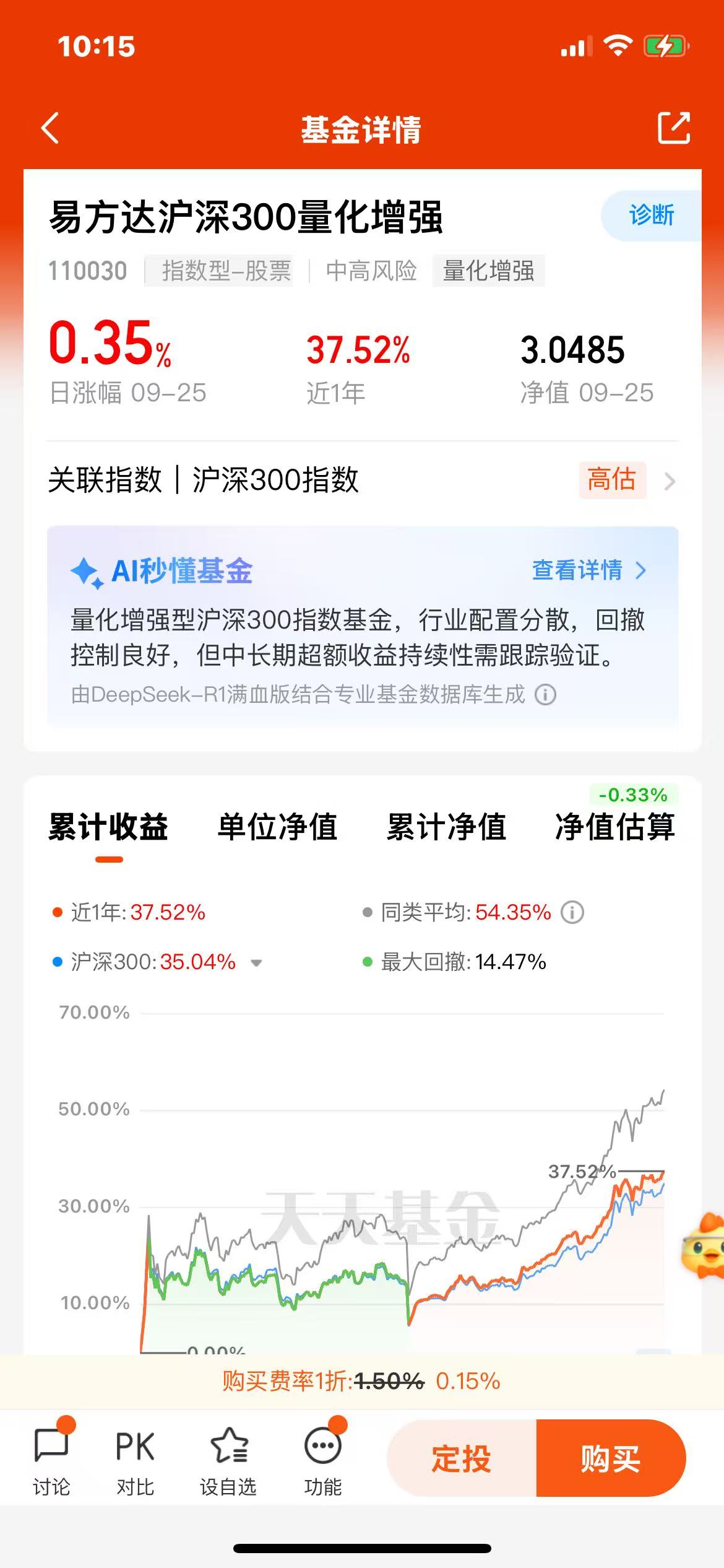 $易方达沪深300量化增强(OTCFUND|110030)$近一年上涨37.52%增强效果明显!