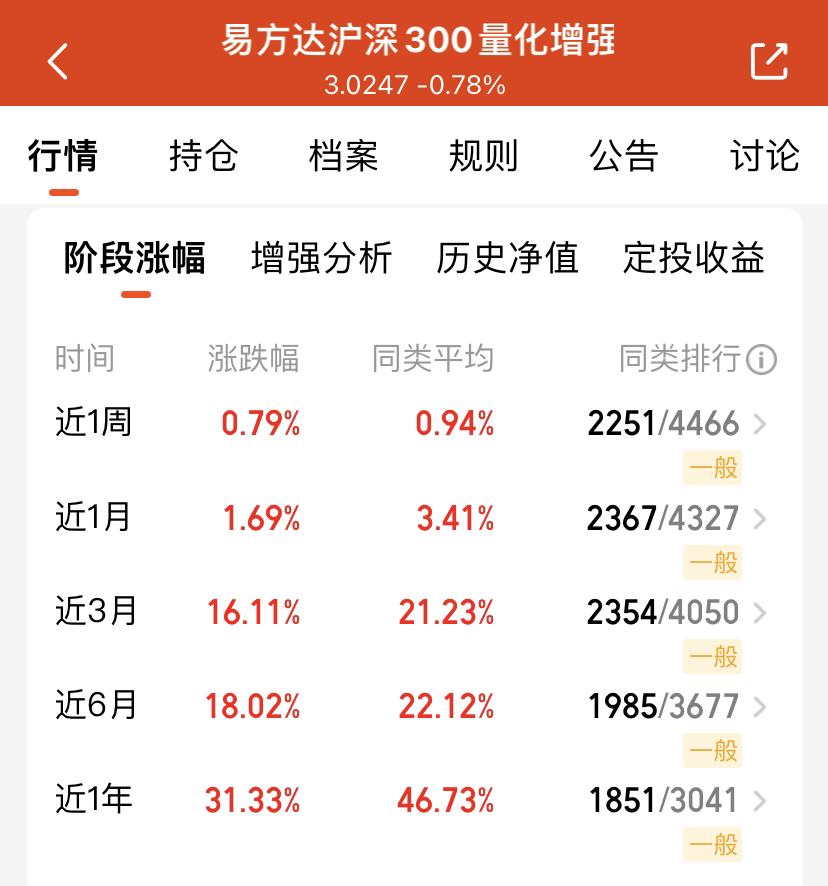 最近行业轮动也太快了,手里大仓位不敢瞎折腾?我现在关注$易方达沪深300量化增强(OTCFUND|110030)$它是均衡型宽基,大仓位上着也放心。关键今年以来涨了18.33%,比沪深300指数的14.94%还能打,增强效果实实在在。我想在震荡里求稳赚点收益,这只基金挺适合我入手~