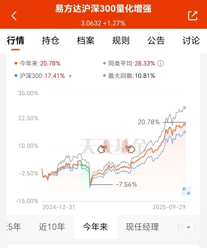当前市场行业轮动节奏加快,要抓单一热点布局难度攀升。牛市行情中,咱都知道市场整体向上核心趋势不改,所以我觉得均衡型宽基会更适合眼下的市场风格。$易方达沪深300量化增强(OTCFUND|110030)$策略较为稳健,紧密跟踪沪深300指数的同时,采用量化增强的策略来获取超额收益加成,今年以来收益率达 20.78%,显著跑赢同期沪深 300 指数 17.44% 的表现,超额收益突出,我今天也布局一下,静待后市有大收获啦。#DeepSeek、寒武纪同步发布引关注#