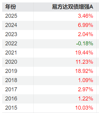 我最近看中了一只双债增强(110035),基金2011年成立以来,只有2022年亏了一点点,其他每一年都是正收益。可以说是稳定穿越牛熊。