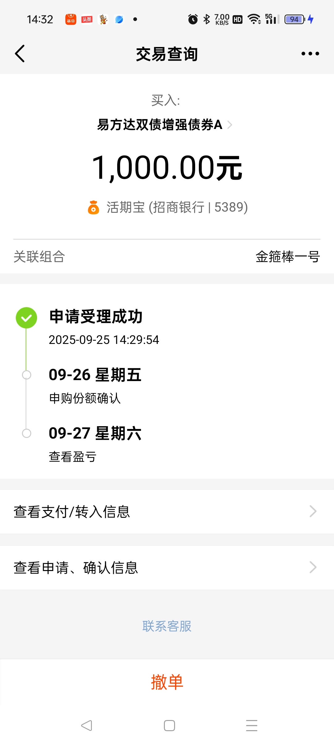 今天买入1000块占坑,后续如果有好的交易机会再考虑加仓。相关基金:易方达双债增强债券A(110035)
