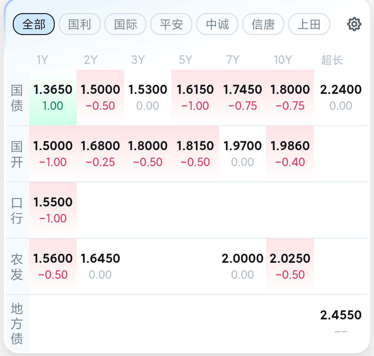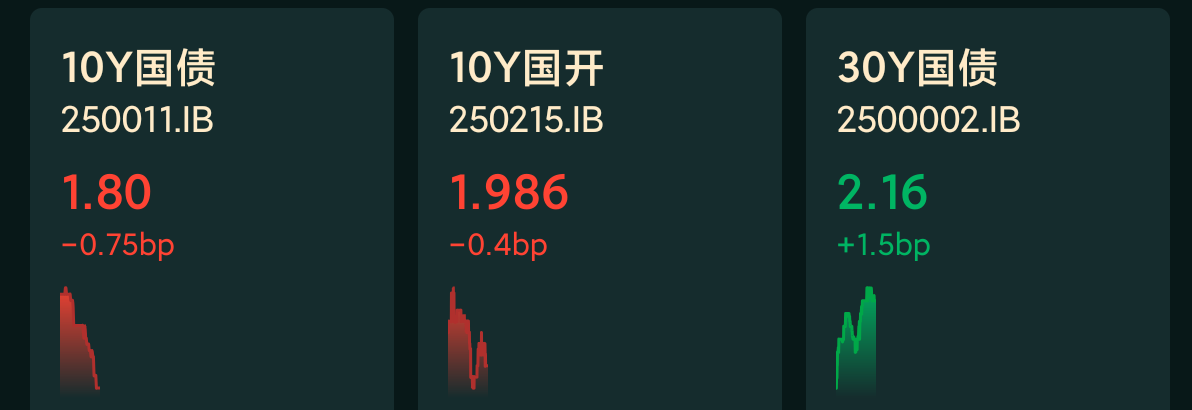 十年期国债收益率:1.80%,-0.75BP(国债收益率越跌,债市越涨)