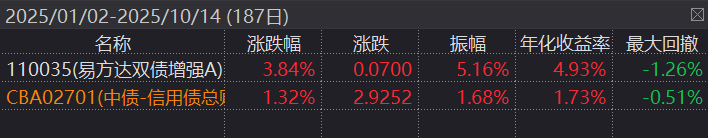 可以关注下易方达双债增强(110035)。作为稳健收益的保守仓位,或者在固收基础上适当增强收益的仓位,都可以考虑一下。基金最大的特点是“双债增强”的投资策略,也就是信用债+可转债,合计投资比例不低于债券资产的80%。截至昨天(10月14日),成立以来累计涨幅达164%,年化收益率超过7.2%。可以说稳定穿越牛熊。