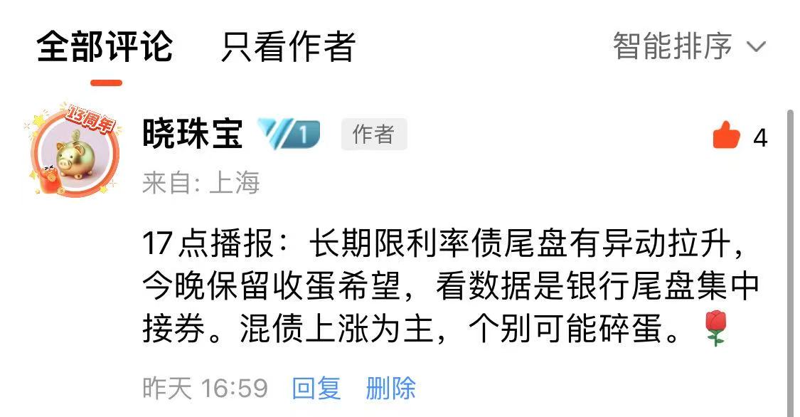 注意,如果播报后,债市尾盘拉升或者跳水,17点左右我会在估值帖子的评论区更新情况。