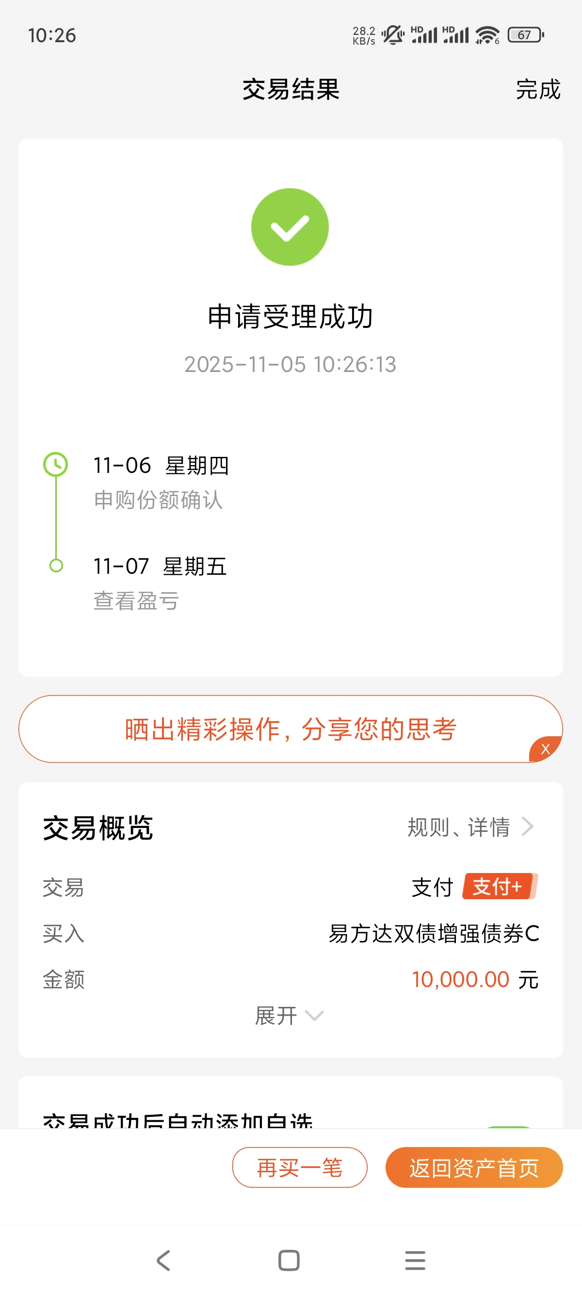 我本人的持仓中,继续加仓1万元易方达双债增强债券C(110036),目前累计持仓债基4万元,预计后续持仓规模到10万元以上。