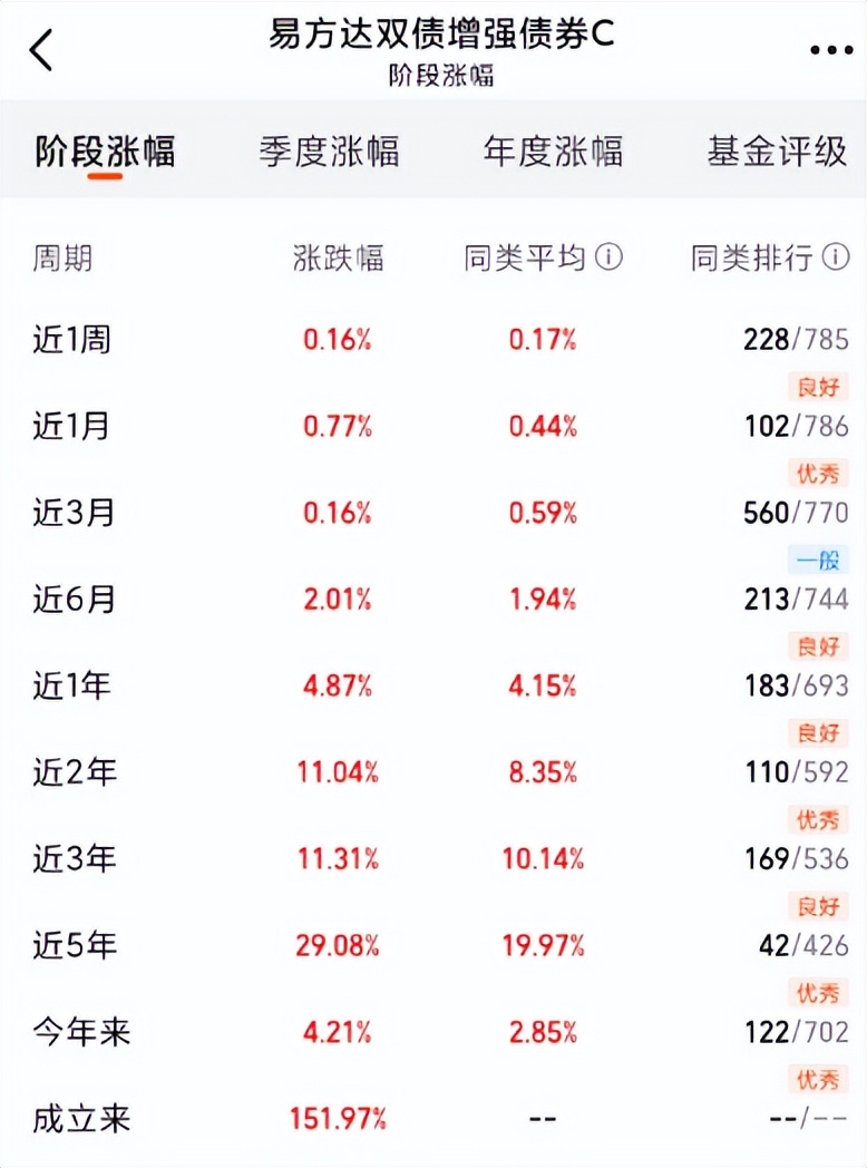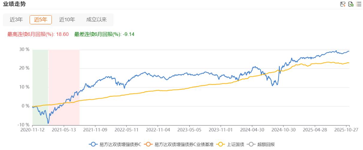 从近5年的业绩走势看,截至11月11日,易方达双债增强债券C(110036)年化收益到6.85%。